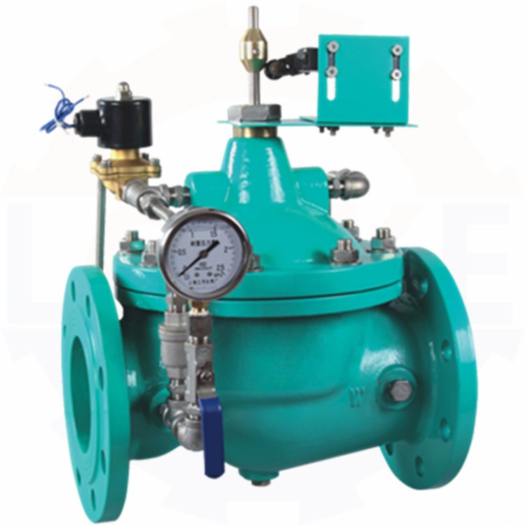 德国LOCKE洛克--进口水泵控制阀由主阀、电磁导阀、针型阀、球阀、止回阀、行程开关装置和压力表组成水力控制接管系统。阀门操作维护方便。只需操作水泵电机启动器的启闭按钮,阀门即按照水泵操作规程实现自动开闭。利用水作用力控制主阀先关闭开启高度的90%,再由行程开关控制水泵滞后关闭,然后主阀关闭,具有介质止回保护水泵的功能。是一种安装在高层建筑以及其他给水系统的水泵出口处,防止介质倒流的逆止类阀门。当水泵即将停止供水前,阀门先行缓慢关闭90%左右,防止突然停泵而产生的水锤或水击声;当水泵完全停止后,阀门再完全关闭,防止泵出的水回流,有效地保护水泵,免受回流的冲击而产生反转。该产品是水泵出口必不可少的保护装置。阀门呈流线型设计。通过电磁阀的导控实现准确的启闭。使用安全可靠,有效地防止水锤和水击声,使用寿命长,安装、维修方便。